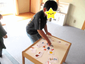 児童発達支援では、語彙の増加や、相手のお話をよく聞くとができるように『絵カード選択』を行いました。