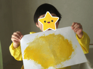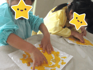 まずは、黄色の絵の具を画用紙に塗っていきます。その上からラップをかけて、手のひらで「ぎゅっぎゅ!」と押したり、「すーっ」と伸ばしたり…
