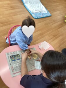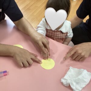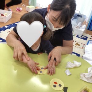 パステルクレヨンの粉を使って、指や手の平を使いパステルアートを楽しんでもらい、ペンで模様も描いてもらいましたよ🍭✨