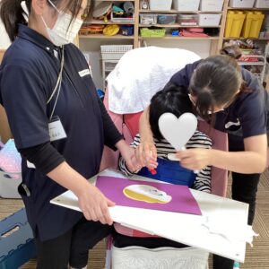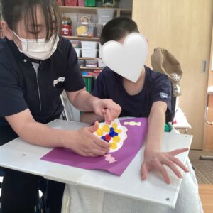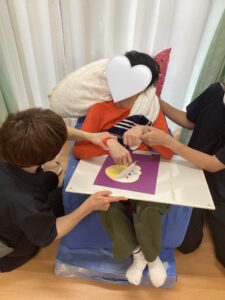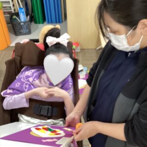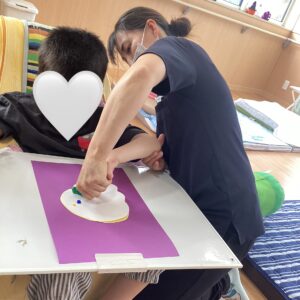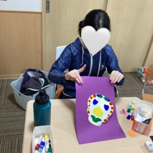 デカルコマニーという技法を使い、絵の具を使って半分に折ったお顔の紙に絵の具を転写させ素敵な模様を作りましたよ!