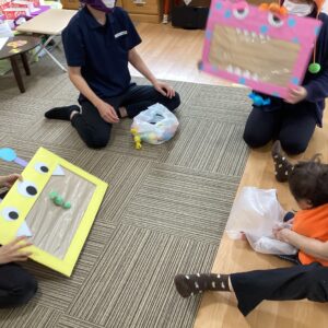 お話の後は風船バズーカーでキャンディーを飛ばし、モンスターに食べさせるゲームで楽しみました♪