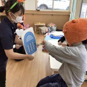 はじめは、“ハロウィンの不思議なドア”というお話から始まり、どの形の鍵を使ったらドアが開くかみんなで考えました🔑
