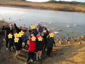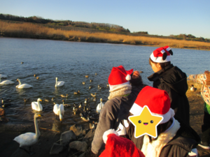 放課後等デイサービスのお友だちは、なんと!サンタクロースになりきって白鳥にエサをあげに行ってきました(* ´艸`)
