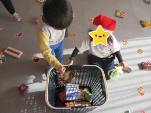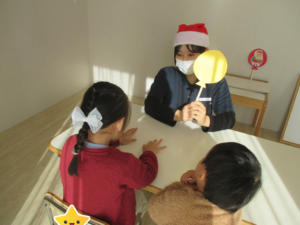 児童発達支援では、クリスマスにちなんだペープサートを楽しんだり、たくさんのプレゼントを釣るゲームをしたりと