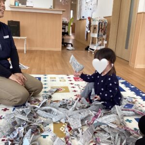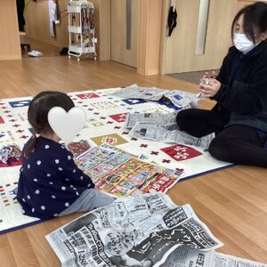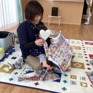 新聞紙の感触を楽しみ、声を出してたくさん笑ってくれたお友だち(*^^*)