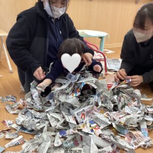 新聞紙を使ってビリビリに破いたり、くしゃくしゃに丸めたり、「ビリビリ」や「カシャカシャ」などの破れる音を聞いたりして感触遊びを行いました✨