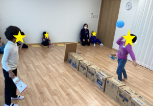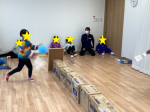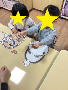 見本を見ながらパーツのマッチングをしたり、先生に「これはどこ?」と聞きながらパーツを置いてみたり、思い思いに福笑いを行い、おもしろい顏ができあがると、みんなで笑って楽しい活動となりました(*^▽^*)