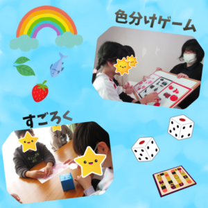児童発達支援では、色に興味を持ち、色と色名が一致することができるように「色分けゲーム」を行いました。