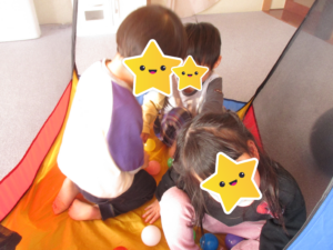 平均台では、バランスをとりながらゆっくり歩くことに挑戦!かっこいいポーズまでしてくれるお友だちもいましたよ☆ボール遊びでは、投げたり転がしたりしながら身体をたくさん動かしました。お友だちと一緒にテントの中にボールを集めたりと笑い声いっぱいの時間となりました✨