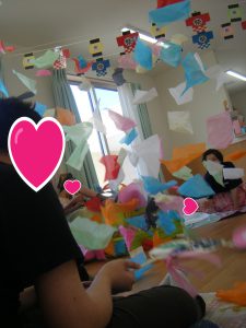 お友だちが作ったうちわを使い風をパタパタ~花紙が綺麗に舞い上がり夏祭りの始まりです(*’▽’)♡